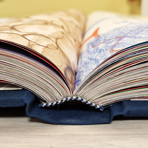 - Ezt a könyvet a kiállítás látogatói lapozzák is, ezért ún. „téphetetlen papírt” (Tyvek) kellett beszereznünk hozzá. Mint kiderült ebben a méretben ez nem is annyira egyszerű feladat.
