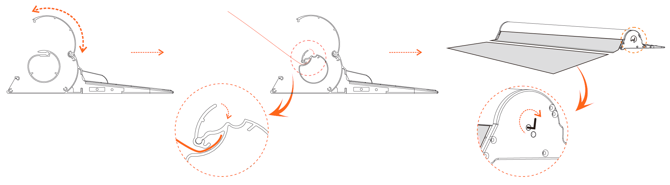 A roll-up szerkezet házának felső íve nyitható. Felnyitás után forgassa úgy Kérjük a tengelyt, hogy fel tudja nyitni a tengelyen lévő vékony alumínium rögzítő klipszet. Ezután vegye ki a régi nyomatot, majd helyezze be az újat. Csukja vissza a rögzítő klippet és a fedelet. Az oldalból kiálló kis tekerőgomb segítségével tudja a felcsévélő szerkezet erejét beállítani.